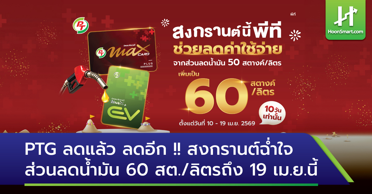 PTG จัดเต็มสงกรานต์! เพิ่มส่วนลดน้ำมันเป็น 60 สต./ลิตร เริ่ม 10-19 เม.ย.69