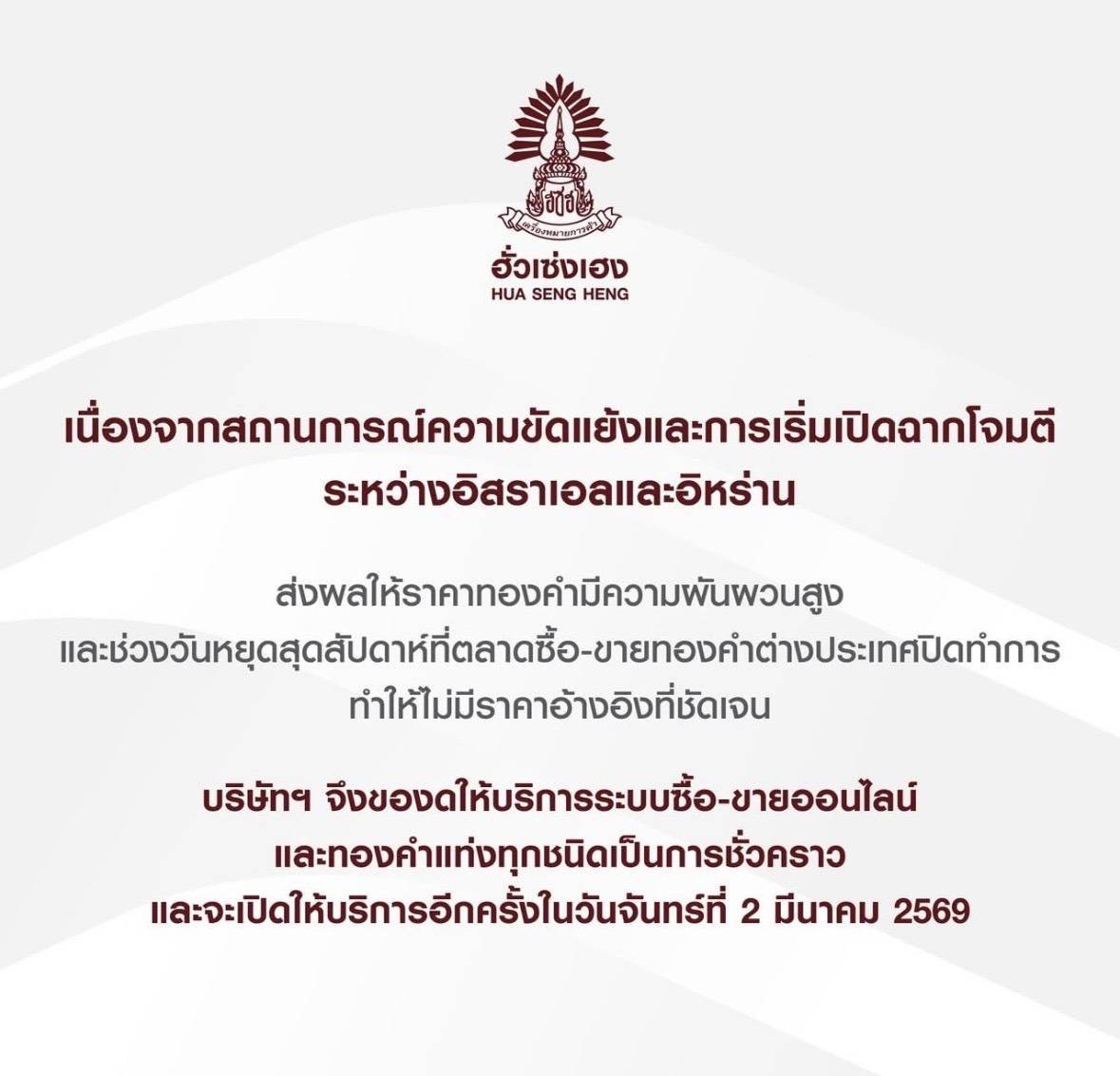 YLG-ฮั่วเซ่งเฮง-แม่ทองสุก หยุดขายทองชั่วคราว เปิดปกติ 2 มี.ค.นี้